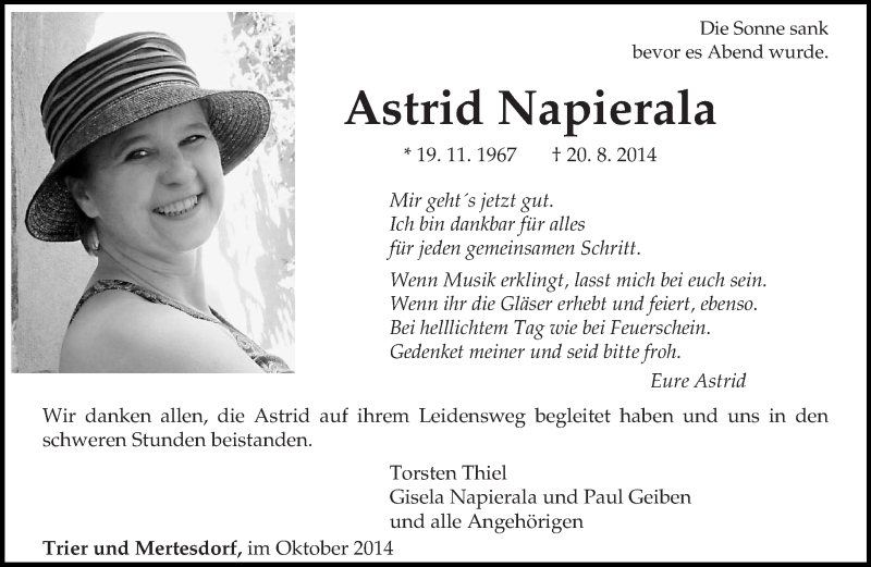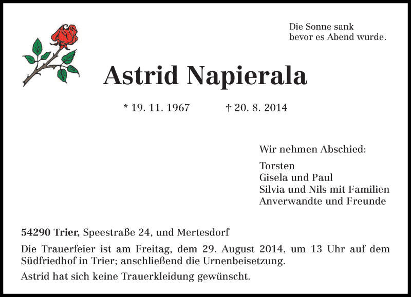 Hier finden Sie alle Traueranzeigen aus der Zeitung, die bisher für Astrid Napierala erschienen sind. Weitere Traueranzeigen, die in der Zeitung erscheinen, werden hier ebenfalls aufgelistet