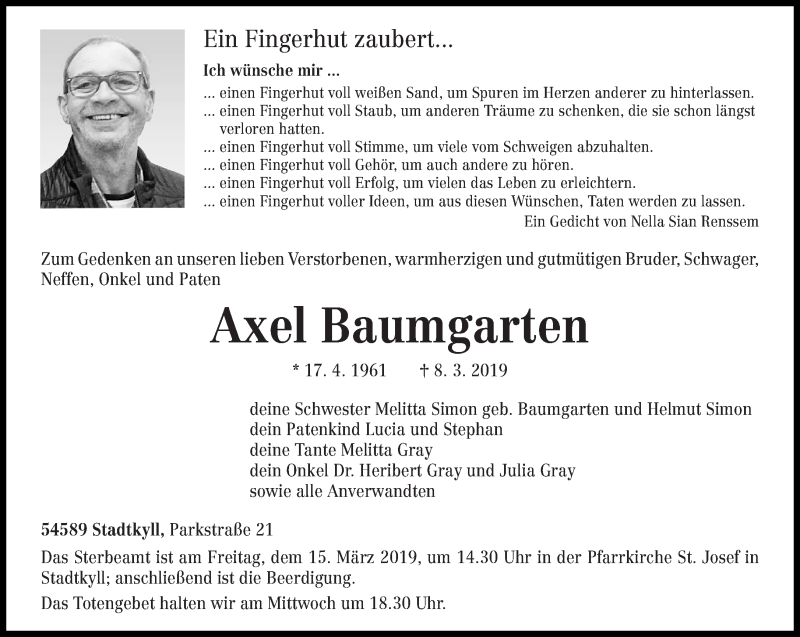 Hier finden Sie alle Traueranzeigen aus der Zeitung, die bisher für Axel Baumgarten erschienen sind. Weitere Traueranzeigen, die in der Zeitung erscheinen, werden hier ebenfalls aufgelistet