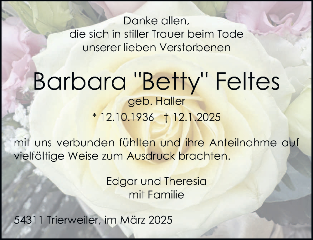 Hier finden Sie alle Traueranzeigen aus der Zeitung, die bisher für Barbara Feltes erschienen sind. Weitere Traueranzeigen, die in der Zeitung erscheinen, werden hier ebenfalls aufgelistet