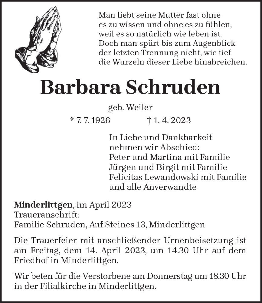 Hier finden Sie alle Traueranzeigen aus der Zeitung, die bisher für Barbara Schruden erschienen sind. Weitere Traueranzeigen, die in der Zeitung erscheinen, werden hier ebenfalls aufgelistet