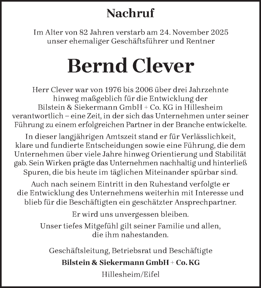 Hier finden Sie alle Traueranzeigen aus der Zeitung, die bisher für Bernd Clever erschienen sind. Weitere Traueranzeigen, die in der Zeitung erscheinen, werden hier ebenfalls aufgelistet