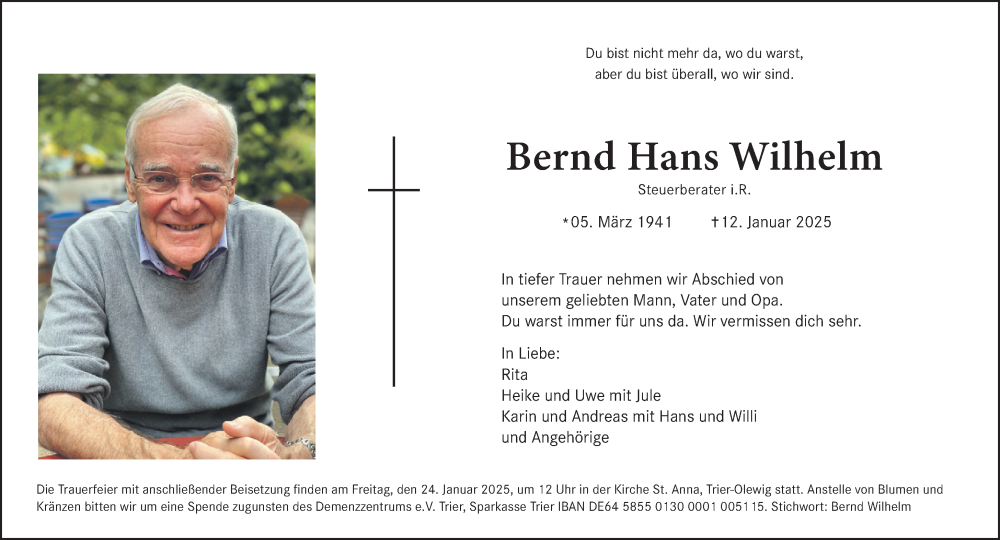 Hier finden Sie alle Traueranzeigen aus der Zeitung, die bisher für Bernd Hans Wilhelm erschienen sind. Weitere Traueranzeigen, die in der Zeitung erscheinen, werden hier ebenfalls aufgelistet