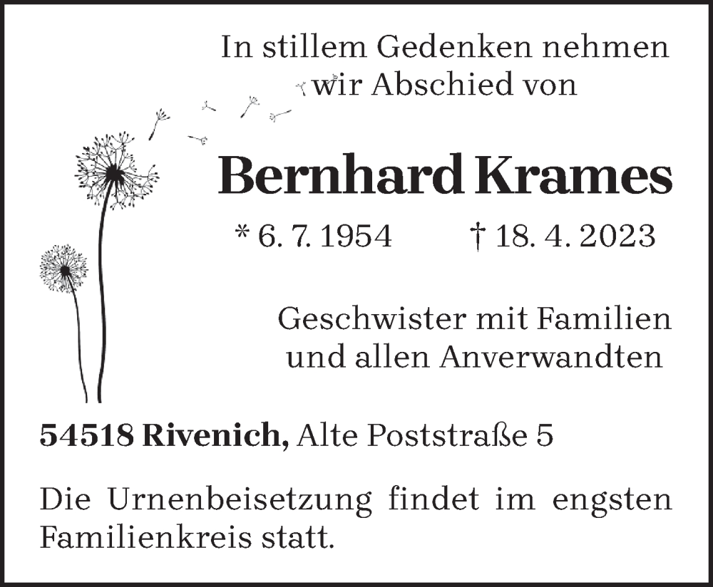 Hier finden Sie alle Traueranzeigen aus der Zeitung, die bisher für Bernhard Krames erschienen sind. Weitere Traueranzeigen, die in der Zeitung erscheinen, werden hier ebenfalls aufgelistet