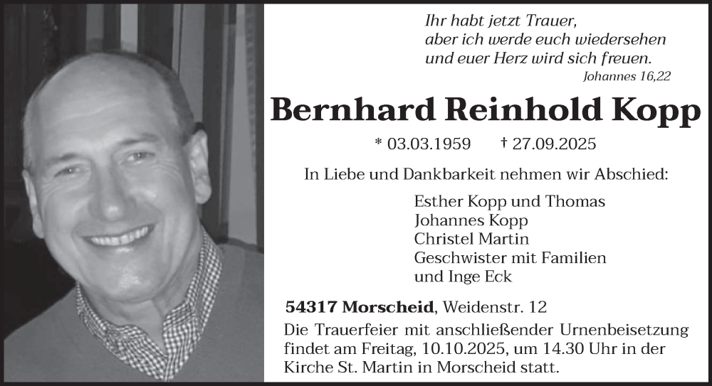 Hier finden Sie alle Traueranzeigen aus der Zeitung, die bisher für Bernhard Reinhold Kopp erschienen sind. Weitere Traueranzeigen, die in der Zeitung erscheinen, werden hier ebenfalls aufgelistet