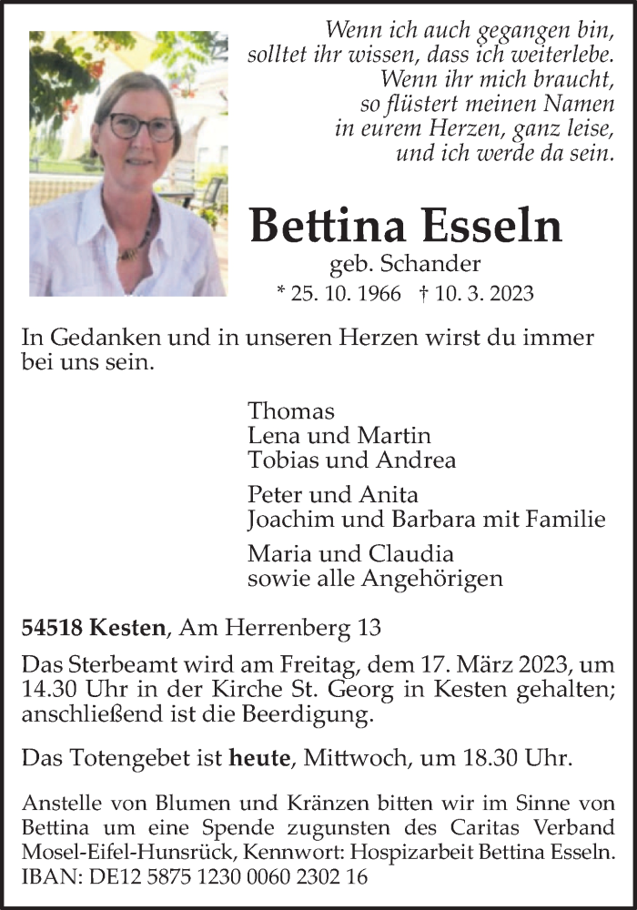 Hier finden Sie alle Traueranzeigen aus der Zeitung, die bisher für Bettina Esseln erschienen sind. Weitere Traueranzeigen, die in der Zeitung erscheinen, werden hier ebenfalls aufgelistet
