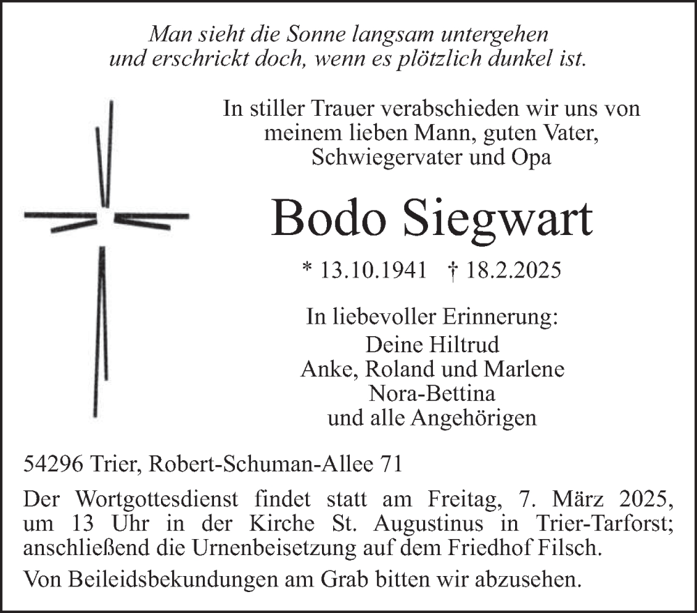 Hier finden Sie alle Traueranzeigen aus der Zeitung, die bisher für Bodo Siegwart erschienen sind. Weitere Traueranzeigen, die in der Zeitung erscheinen, werden hier ebenfalls aufgelistet