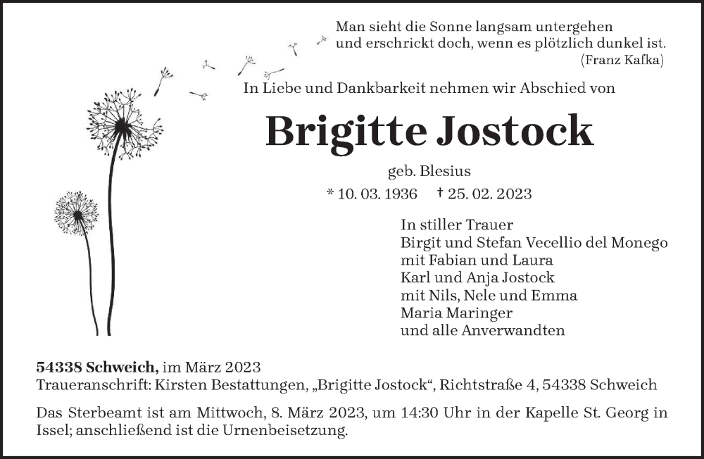 Hier finden Sie alle Traueranzeigen aus der Zeitung, die bisher für Brigitte Jostock erschienen sind. Weitere Traueranzeigen, die in der Zeitung erscheinen, werden hier ebenfalls aufgelistet