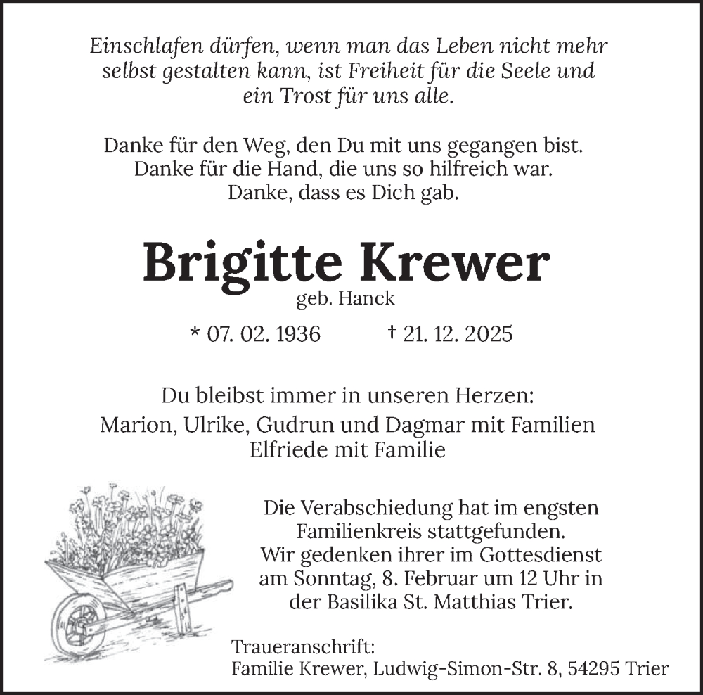 Hier finden Sie alle Traueranzeigen aus der Zeitung, die bisher für Brigitte Krewer erschienen sind. Weitere Traueranzeigen, die in der Zeitung erscheinen, werden hier ebenfalls aufgelistet