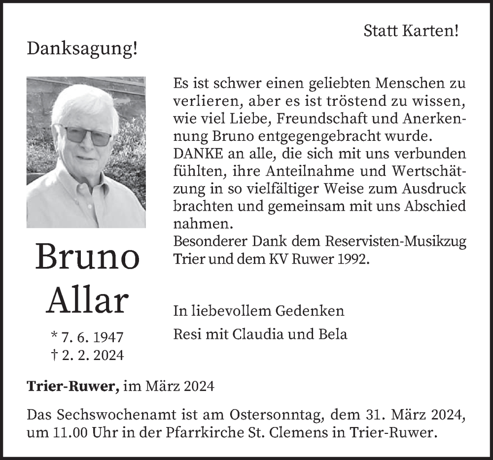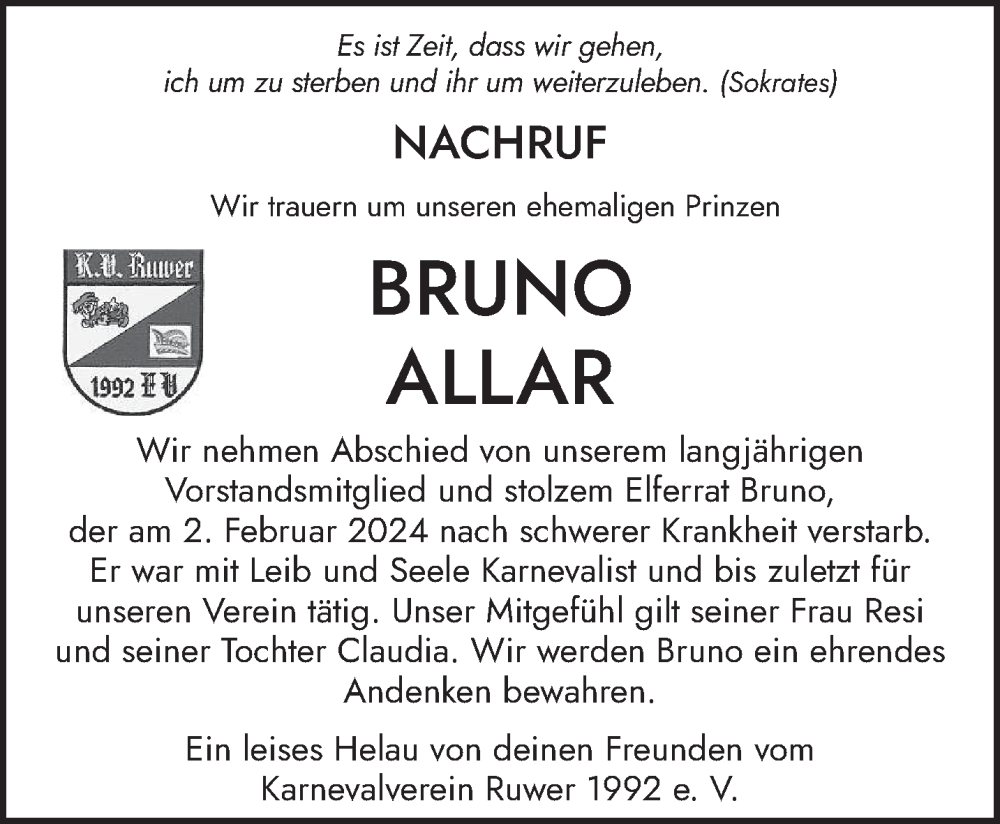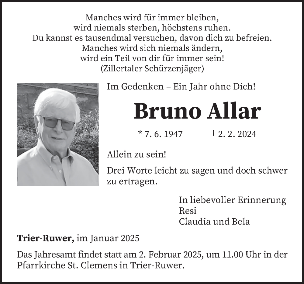 Hier finden Sie alle Traueranzeigen aus der Zeitung, die bisher für Bruno Allar erschienen sind. Weitere Traueranzeigen, die in der Zeitung erscheinen, werden hier ebenfalls aufgelistet