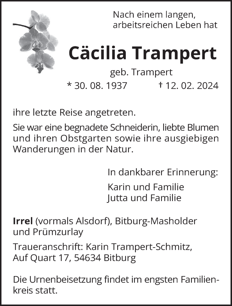 Hier finden Sie alle Traueranzeigen aus der Zeitung, die bisher für Cäcilia Trampert erschienen sind. Weitere Traueranzeigen, die in der Zeitung erscheinen, werden hier ebenfalls aufgelistet