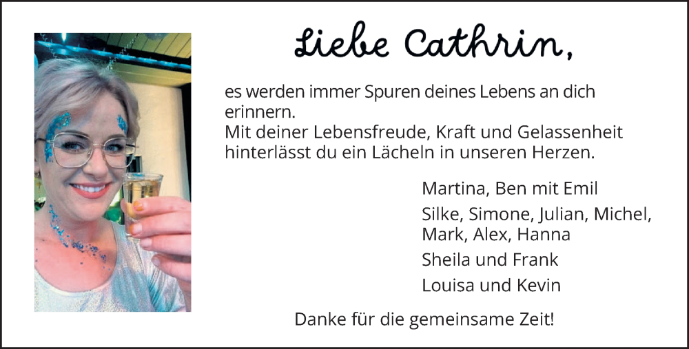 Hier finden Sie alle Traueranzeigen aus der Zeitung, die bisher für Cathrin erschienen sind. Weitere Traueranzeigen, die in der Zeitung erscheinen, werden hier ebenfalls aufgelistet