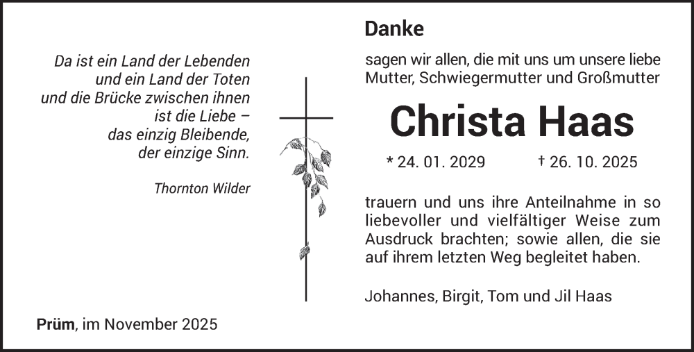 Hier finden Sie alle Traueranzeigen aus der Zeitung, die bisher für Christa Haas erschienen sind. Weitere Traueranzeigen, die in der Zeitung erscheinen, werden hier ebenfalls aufgelistet