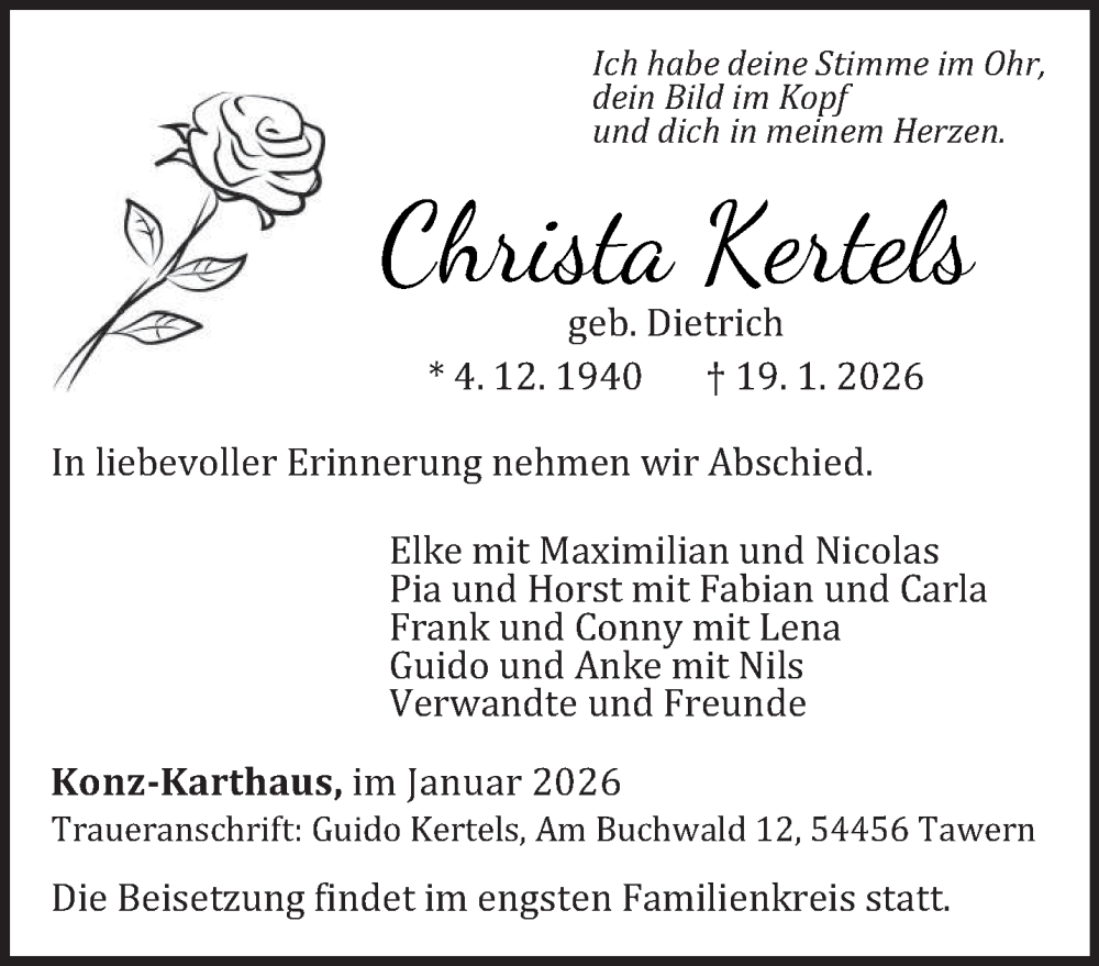 Hier finden Sie alle Traueranzeigen aus der Zeitung, die bisher für Christa Kertels erschienen sind. Weitere Traueranzeigen, die in der Zeitung erscheinen, werden hier ebenfalls aufgelistet