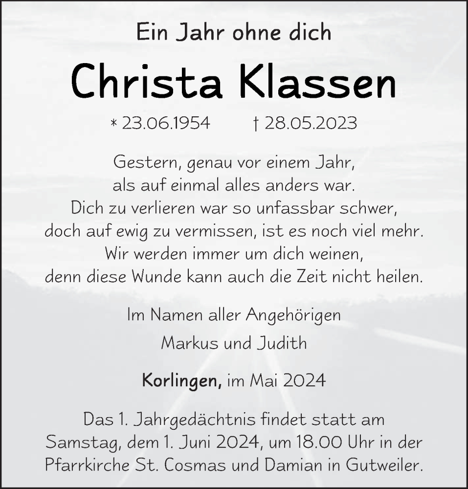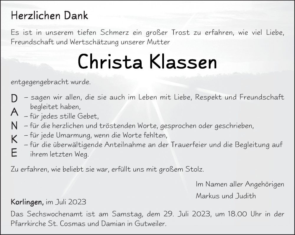 Hier finden Sie alle Traueranzeigen aus der Zeitung, die bisher für Christa Klassen erschienen sind. Weitere Traueranzeigen, die in der Zeitung erscheinen, werden hier ebenfalls aufgelistet