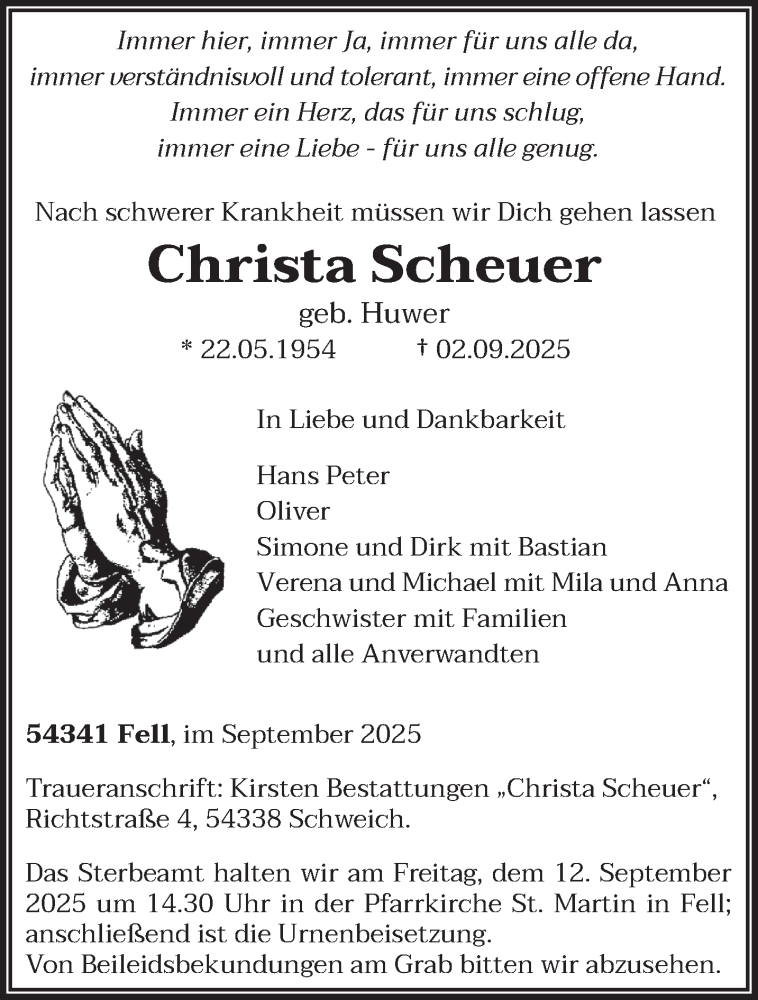 Hier finden Sie alle Traueranzeigen aus der Zeitung, die bisher für Christa Scheuer erschienen sind. Weitere Traueranzeigen, die in der Zeitung erscheinen, werden hier ebenfalls aufgelistet