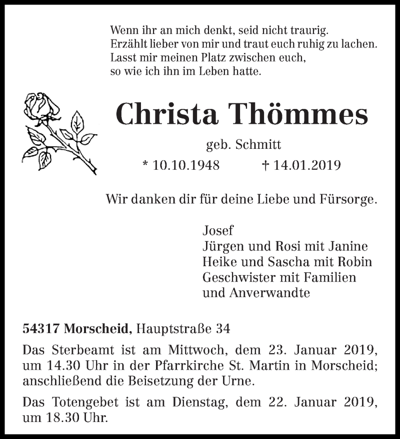 Hier finden Sie alle Traueranzeigen aus der Zeitung, die bisher für Christa Thömmes erschienen sind. Weitere Traueranzeigen, die in der Zeitung erscheinen, werden hier ebenfalls aufgelistet