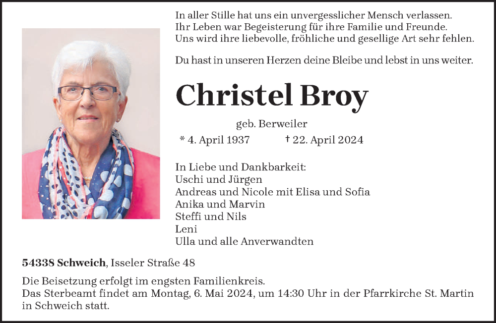 Hier finden Sie alle Traueranzeigen aus der Zeitung, die bisher für Christel Broy erschienen sind. Weitere Traueranzeigen, die in der Zeitung erscheinen, werden hier ebenfalls aufgelistet