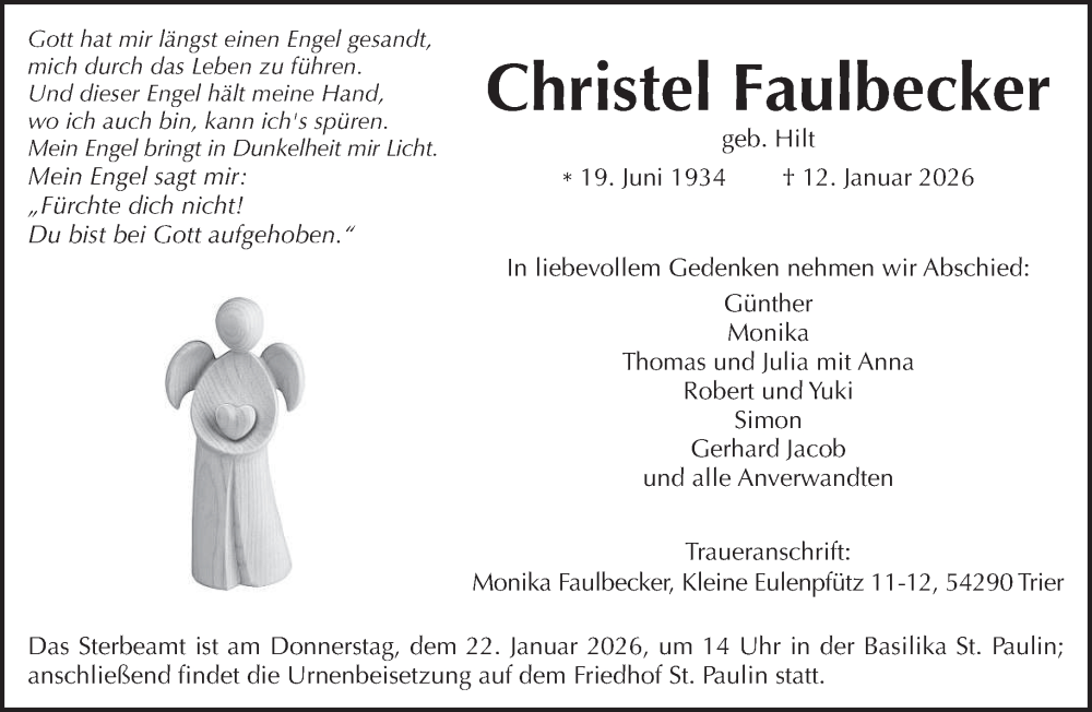 Hier finden Sie alle Traueranzeigen aus der Zeitung, die bisher für Christel Faulbecker erschienen sind. Weitere Traueranzeigen, die in der Zeitung erscheinen, werden hier ebenfalls aufgelistet