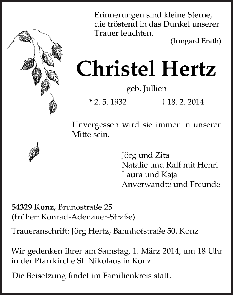 Hier finden Sie alle Traueranzeigen aus der Zeitung, die bisher für Christel Hertz erschienen sind. Weitere Traueranzeigen, die in der Zeitung erscheinen, werden hier ebenfalls aufgelistet