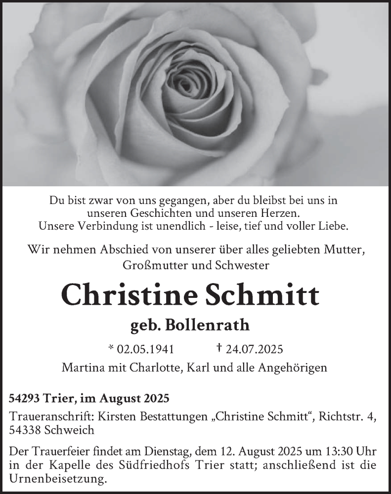 Hier finden Sie alle Traueranzeigen aus der Zeitung, die bisher für Christine Schmitt erschienen sind. Weitere Traueranzeigen, die in der Zeitung erscheinen, werden hier ebenfalls aufgelistet