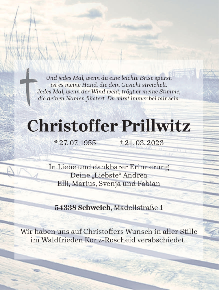 Hier finden Sie alle Traueranzeigen aus der Zeitung, die bisher für Christoffer Prillwitz erschienen sind. Weitere Traueranzeigen, die in der Zeitung erscheinen, werden hier ebenfalls aufgelistet