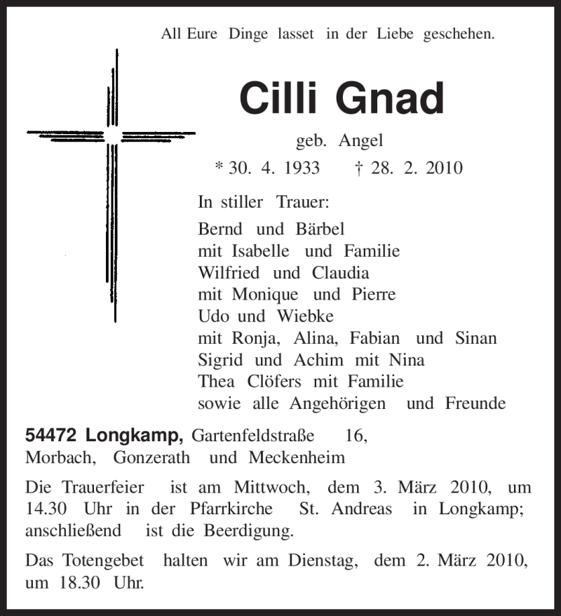 Hier finden Sie alle Traueranzeigen aus der Zeitung, die bisher für Cilli Gnad erschienen sind. Weitere Traueranzeigen, die in der Zeitung erscheinen, werden hier ebenfalls aufgelistet