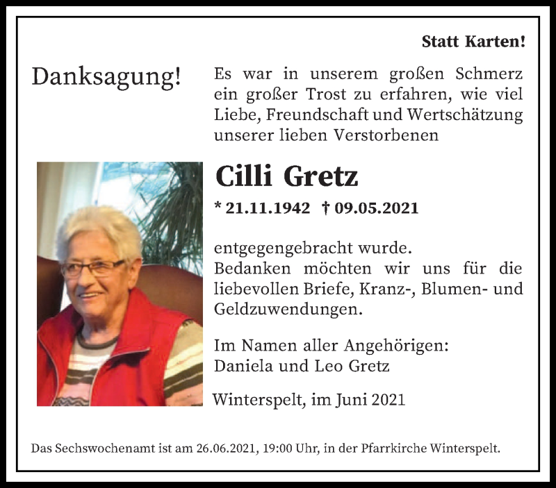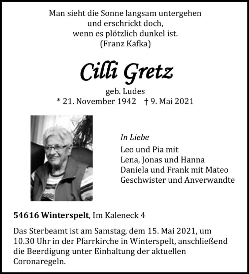 Hier finden Sie alle Traueranzeigen aus der Zeitung, die bisher für Cilli Gretz erschienen sind. Weitere Traueranzeigen, die in der Zeitung erscheinen, werden hier ebenfalls aufgelistet