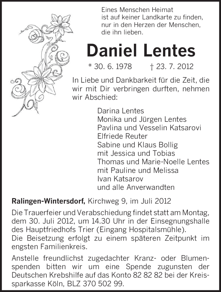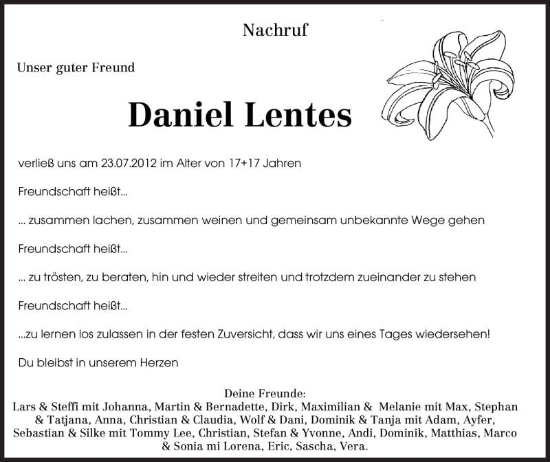 Hier finden Sie alle Traueranzeigen aus der Zeitung, die bisher für Daniel Lentes erschienen sind. Weitere Traueranzeigen, die in der Zeitung erscheinen, werden hier ebenfalls aufgelistet