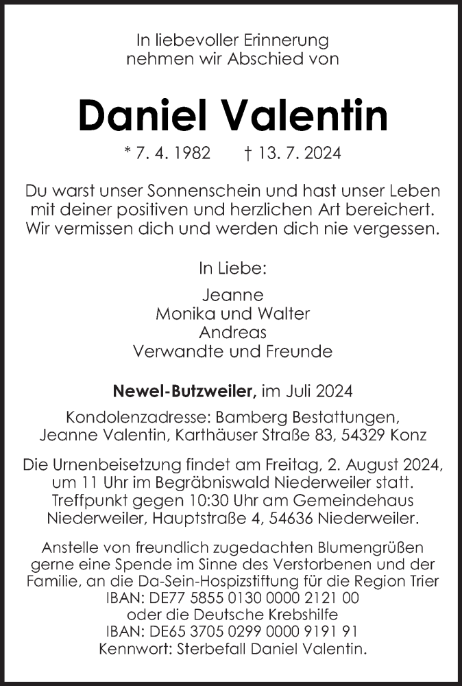 Hier finden Sie alle Traueranzeigen aus der Zeitung, die bisher für Daniel Valentin erschienen sind. Weitere Traueranzeigen, die in der Zeitung erscheinen, werden hier ebenfalls aufgelistet