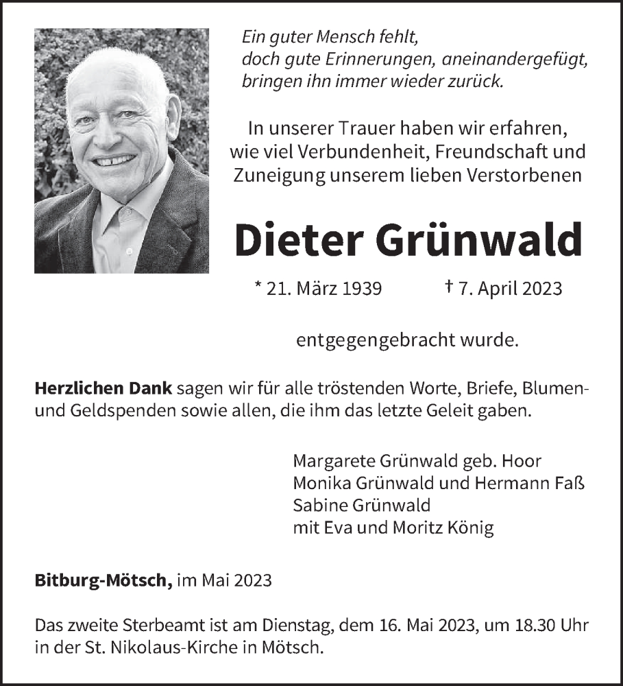 Hier finden Sie alle Traueranzeigen aus der Zeitung, die bisher für Dieter Grünwald erschienen sind. Weitere Traueranzeigen, die in der Zeitung erscheinen, werden hier ebenfalls aufgelistet