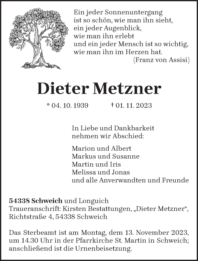 Hier finden Sie alle Traueranzeigen aus der Zeitung, die bisher für Dieter Metzner erschienen sind. Weitere Traueranzeigen, die in der Zeitung erscheinen, werden hier ebenfalls aufgelistet