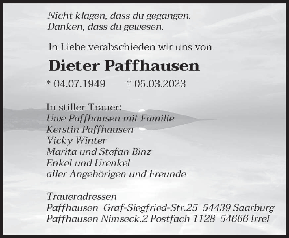 Hier finden Sie alle Traueranzeigen aus der Zeitung, die bisher für Dieter Paffhausen erschienen sind. Weitere Traueranzeigen, die in der Zeitung erscheinen, werden hier ebenfalls aufgelistet