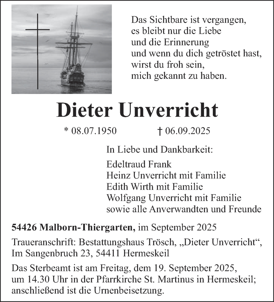 Hier finden Sie alle Traueranzeigen aus der Zeitung, die bisher für Dieter Unverricht erschienen sind. Weitere Traueranzeigen, die in der Zeitung erscheinen, werden hier ebenfalls aufgelistet