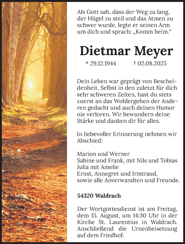 Hier finden Sie alle Traueranzeigen aus der Zeitung, die bisher für Dietmar Meyer erschienen sind. Weitere Traueranzeigen, die in der Zeitung erscheinen, werden hier ebenfalls aufgelistet