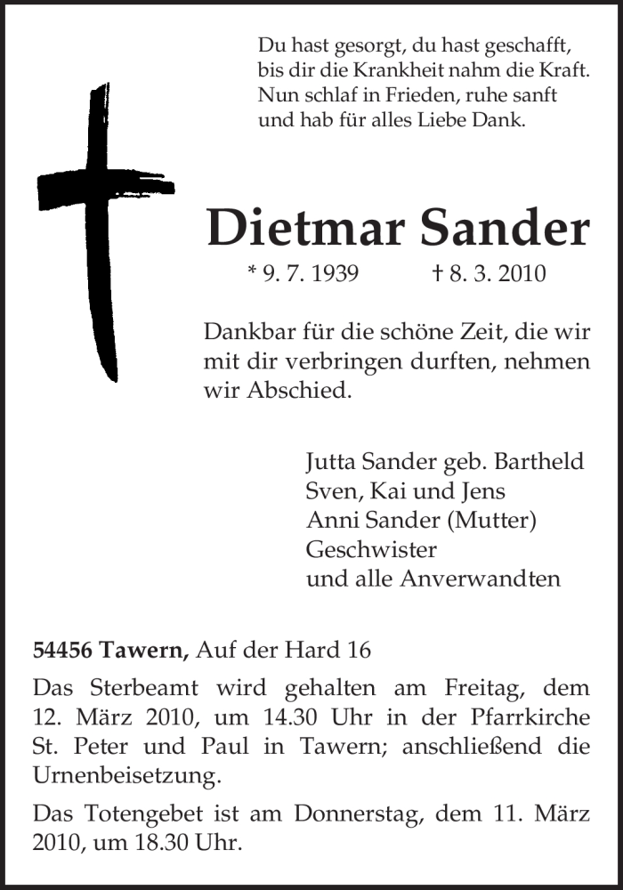 Hier finden Sie alle Traueranzeigen aus der Zeitung, die bisher für Dietmar Sander erschienen sind. Weitere Traueranzeigen, die in der Zeitung erscheinen, werden hier ebenfalls aufgelistet