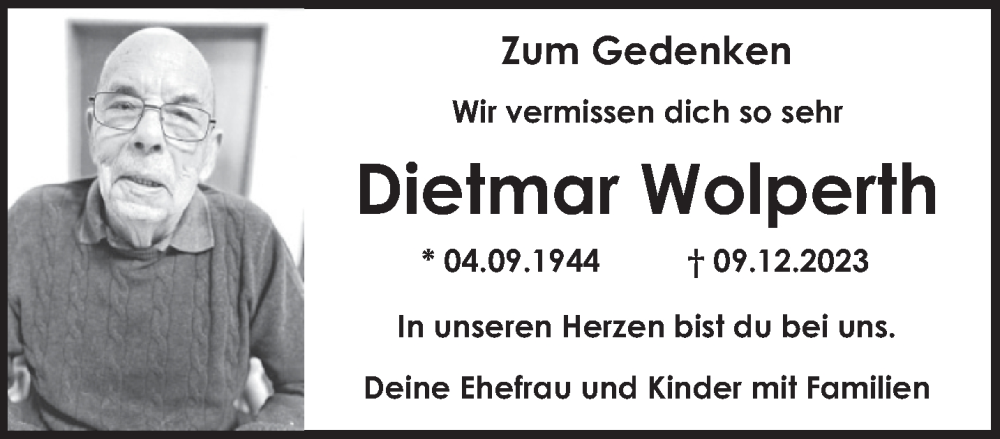 Hier finden Sie alle Traueranzeigen aus der Zeitung, die bisher für Dietmar Wolperth erschienen sind. Weitere Traueranzeigen, die in der Zeitung erscheinen, werden hier ebenfalls aufgelistet