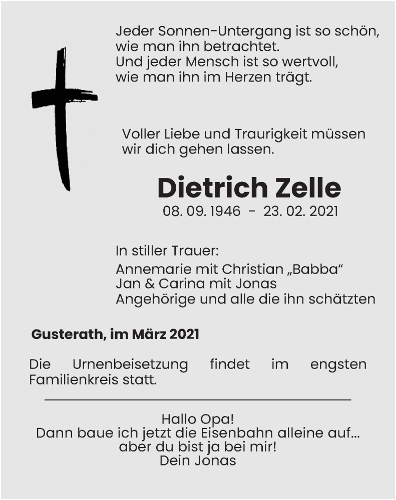 Hier finden Sie alle Traueranzeigen aus der Zeitung, die bisher für Dietrich Zelle erschienen sind. Weitere Traueranzeigen, die in der Zeitung erscheinen, werden hier ebenfalls aufgelistet