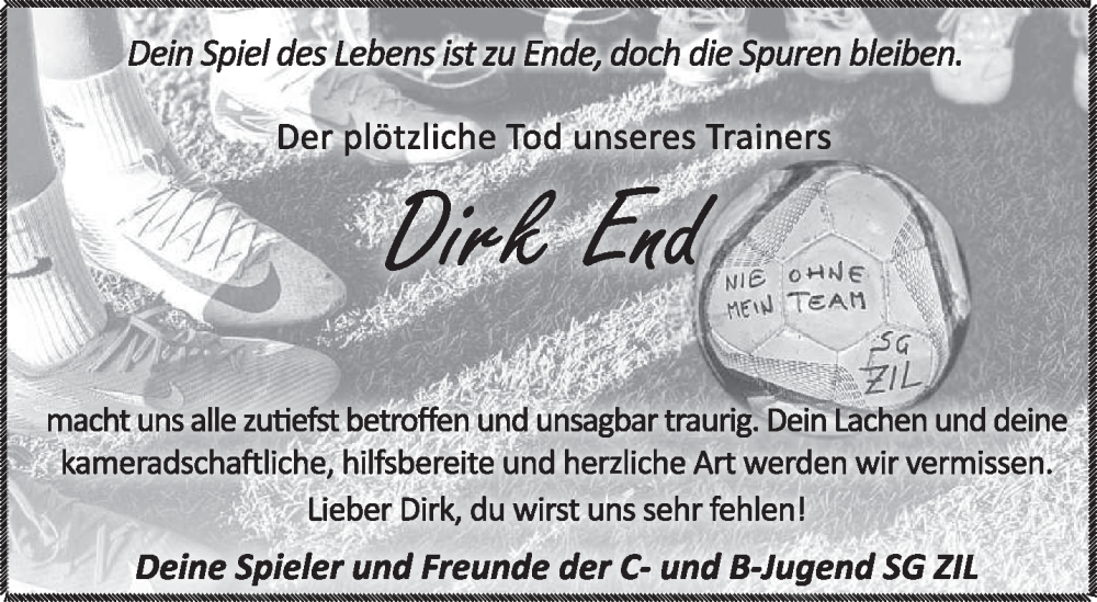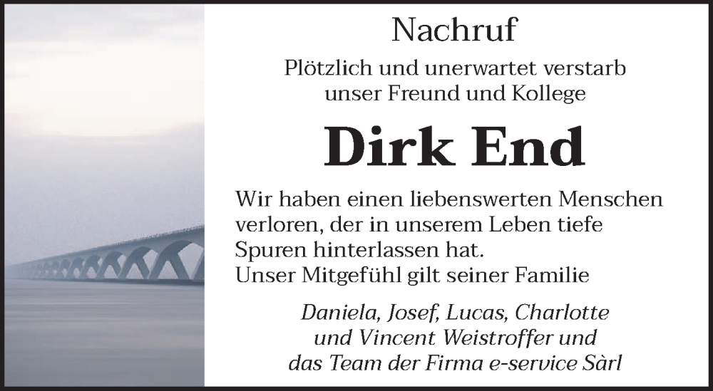Hier finden Sie alle Traueranzeigen aus der Zeitung, die bisher für Dirk End erschienen sind. Weitere Traueranzeigen, die in der Zeitung erscheinen, werden hier ebenfalls aufgelistet