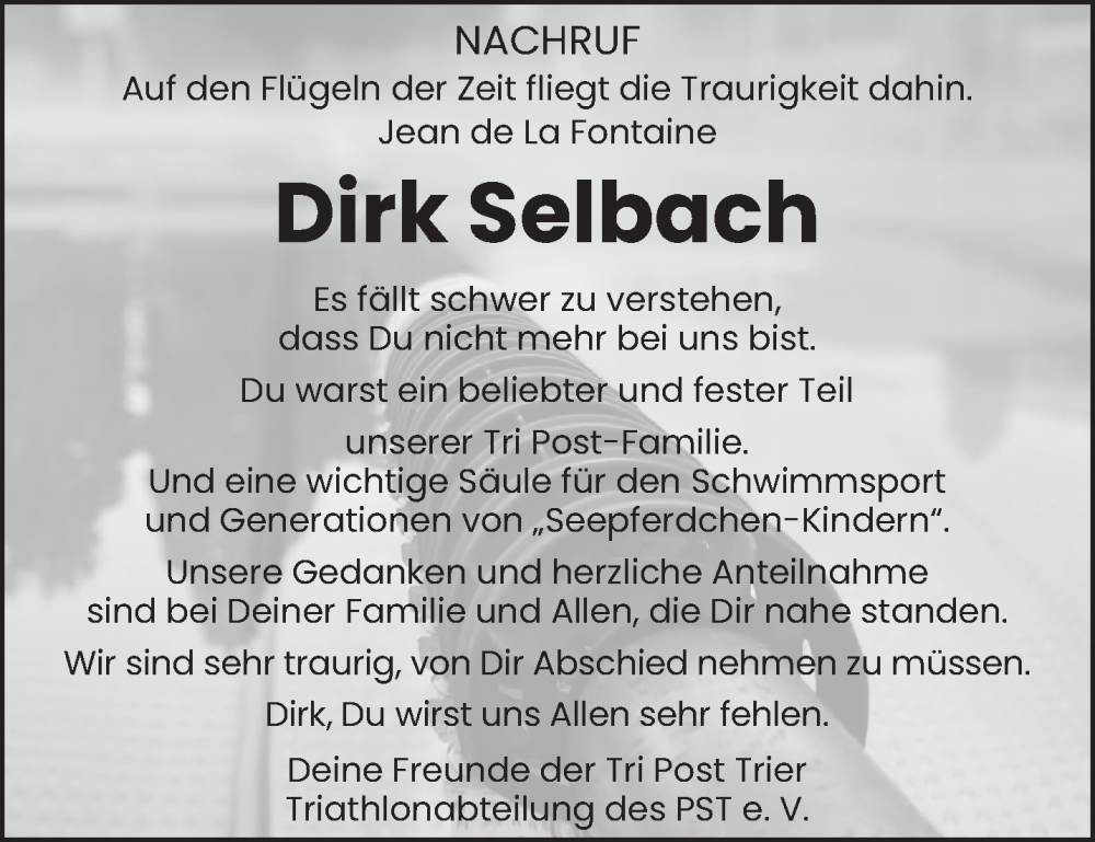 Hier finden Sie alle Traueranzeigen aus der Zeitung, die bisher für Dirk Selbach erschienen sind. Weitere Traueranzeigen, die in der Zeitung erscheinen, werden hier ebenfalls aufgelistet