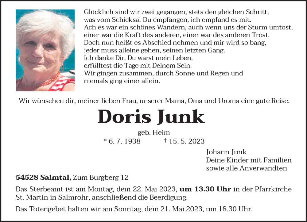 Hier finden Sie alle Traueranzeigen aus der Zeitung, die bisher für Doris Junk erschienen sind. Weitere Traueranzeigen, die in der Zeitung erscheinen, werden hier ebenfalls aufgelistet
