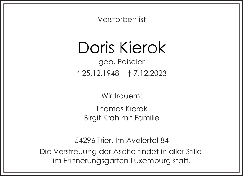 Hier finden Sie alle Traueranzeigen aus der Zeitung, die bisher für Doris Kierok erschienen sind. Weitere Traueranzeigen, die in der Zeitung erscheinen, werden hier ebenfalls aufgelistet