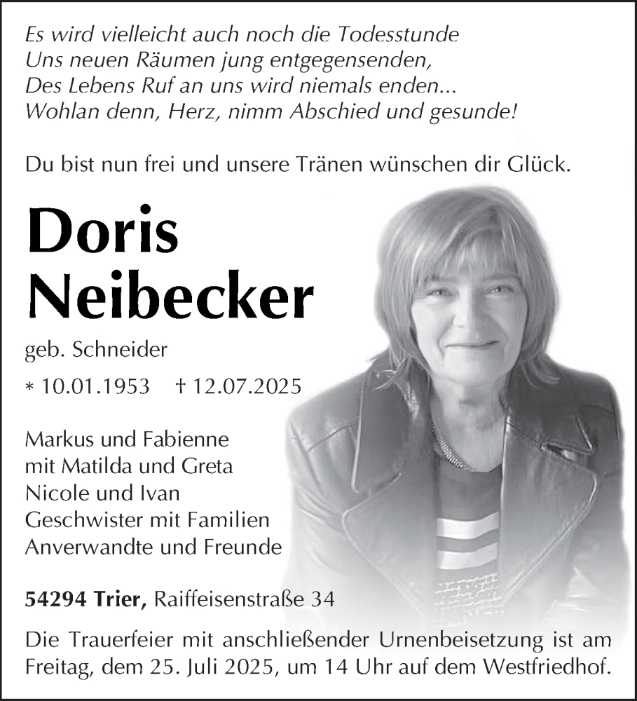 Hier finden Sie alle Traueranzeigen aus der Zeitung, die bisher für Doris Neibecker erschienen sind. Weitere Traueranzeigen, die in der Zeitung erscheinen, werden hier ebenfalls aufgelistet