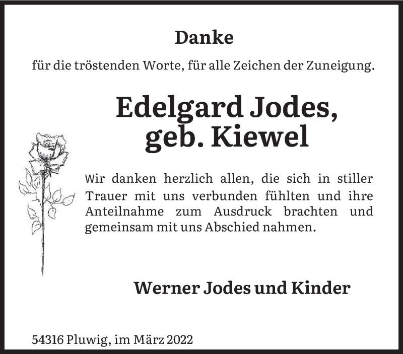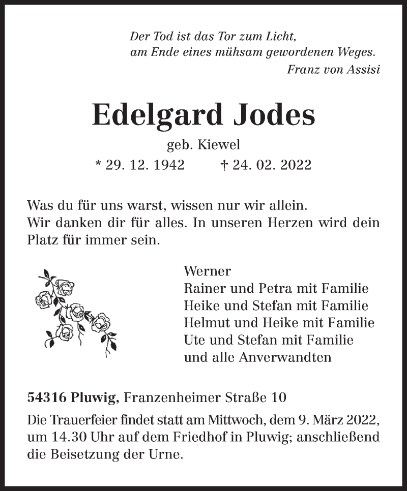Hier finden Sie alle Traueranzeigen aus der Zeitung, die bisher für Edelgard Jodes erschienen sind. Weitere Traueranzeigen, die in der Zeitung erscheinen, werden hier ebenfalls aufgelistet