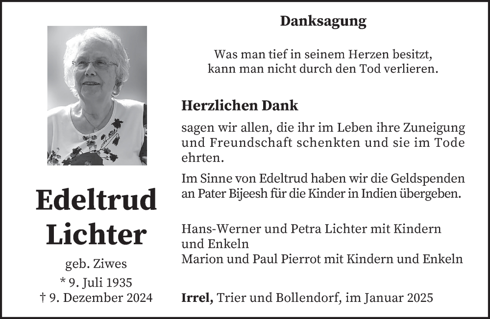 Hier finden Sie alle Traueranzeigen aus der Zeitung, die bisher für Edeltrud Lichter erschienen sind. Weitere Traueranzeigen, die in der Zeitung erscheinen, werden hier ebenfalls aufgelistet