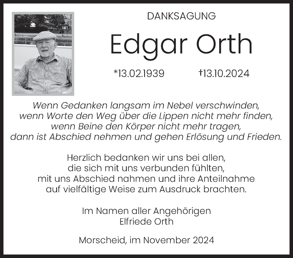 Hier finden Sie alle Traueranzeigen aus der Zeitung, die bisher für Edgar Orth erschienen sind. Weitere Traueranzeigen, die in der Zeitung erscheinen, werden hier ebenfalls aufgelistet