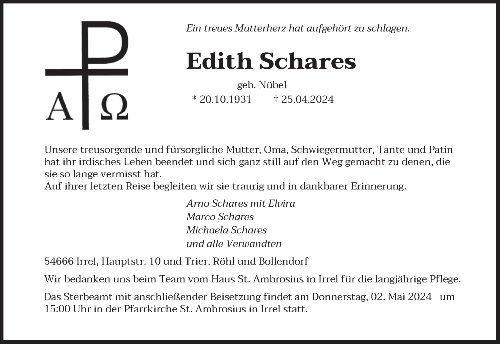 Hier finden Sie alle Traueranzeigen aus der Zeitung, die bisher für Edith Schares erschienen sind. Weitere Traueranzeigen, die in der Zeitung erscheinen, werden hier ebenfalls aufgelistet