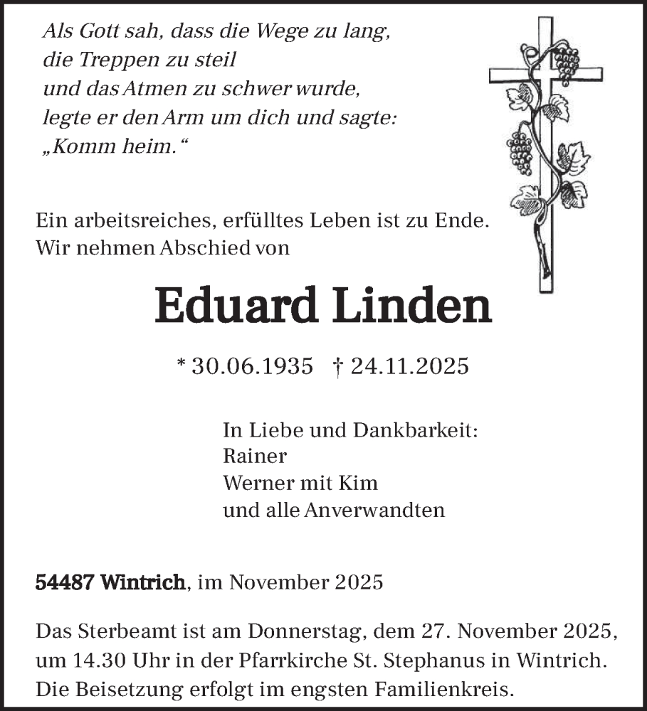 Hier finden Sie alle Traueranzeigen aus der Zeitung, die bisher für Eduard Linden erschienen sind. Weitere Traueranzeigen, die in der Zeitung erscheinen, werden hier ebenfalls aufgelistet