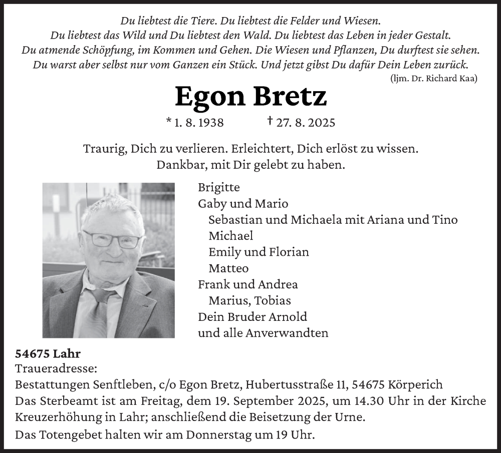 Hier finden Sie alle Traueranzeigen aus der Zeitung, die bisher für Egon Bretz erschienen sind. Weitere Traueranzeigen, die in der Zeitung erscheinen, werden hier ebenfalls aufgelistet