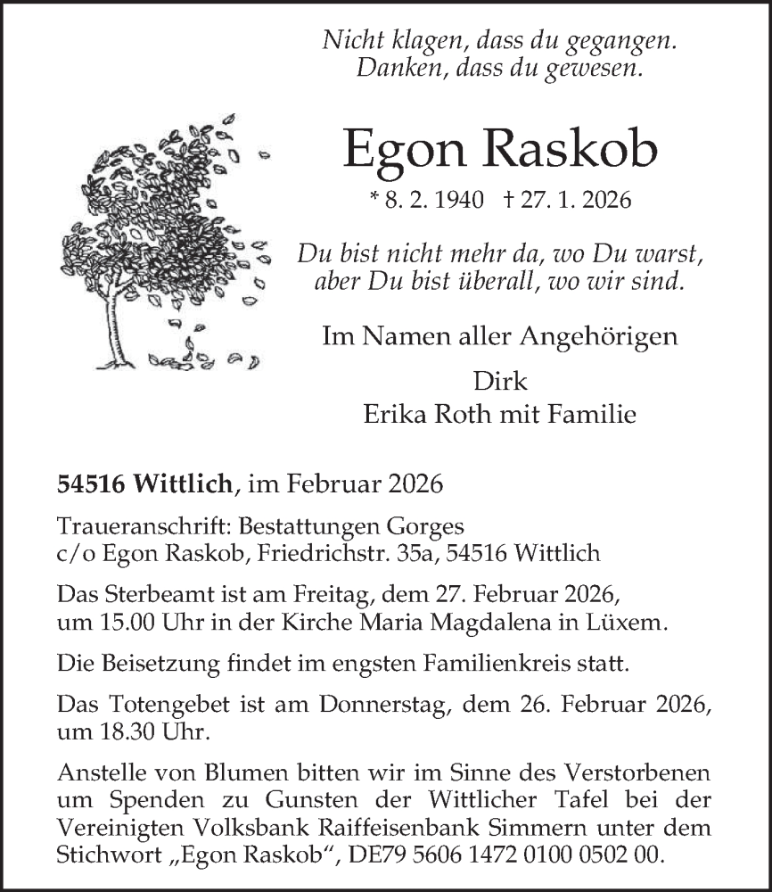 Hier finden Sie alle Traueranzeigen aus der Zeitung, die bisher für Egon Raskob erschienen sind. Weitere Traueranzeigen, die in der Zeitung erscheinen, werden hier ebenfalls aufgelistet