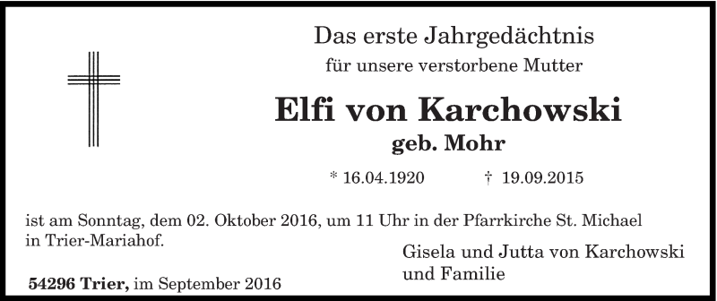 Hier finden Sie alle Traueranzeigen aus der Zeitung, die bisher für Elfi von Karchowski erschienen sind. Weitere Traueranzeigen, die in der Zeitung erscheinen, werden hier ebenfalls aufgelistet
